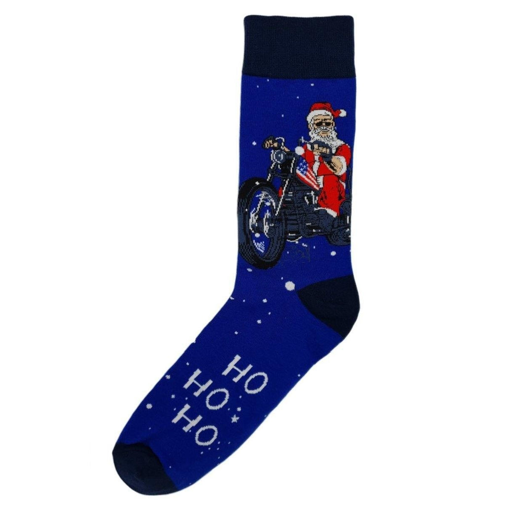 Santa on a Motorcycle Socks – A bold navy design showcasing Santa riding into Christmas in style.